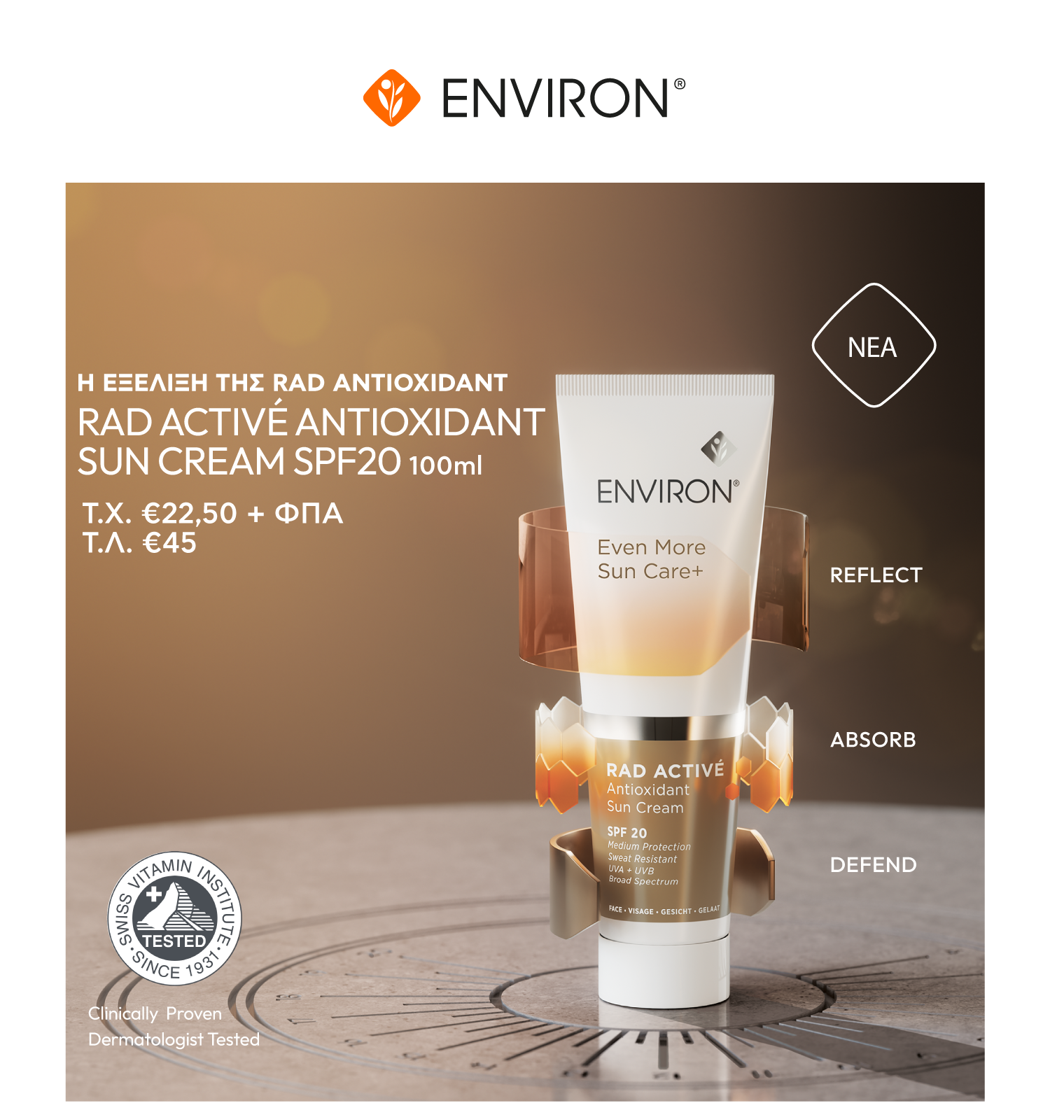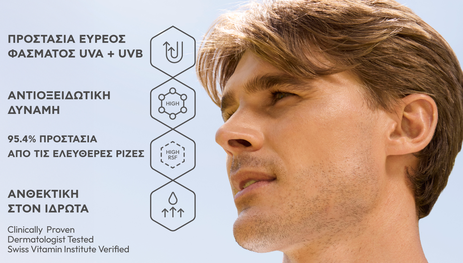 Ανάλαφρη φόρμουλα νέας γενιάς, προσφέρει απαραίτητη καθημερινή προστασία ευρέος φάσματος UVA + UVB, με υψηλή αντιοξειδωτική ισχύ, κλινικά αποδεδειγμένη για την προστασία από βλάβες που προκαλούνται από τις ελεύθερες ρίζες. Ανθεκτική στον ιδρώτα και κατάλληλη για όλους τους τύπους δέρματος, συμπεριλαμβανομένων των ευαίσθητων. Επαληθευμένη από το Swiss Vitamin Institute. Κλινικά και Δερματολογικά Ελεγμένη.