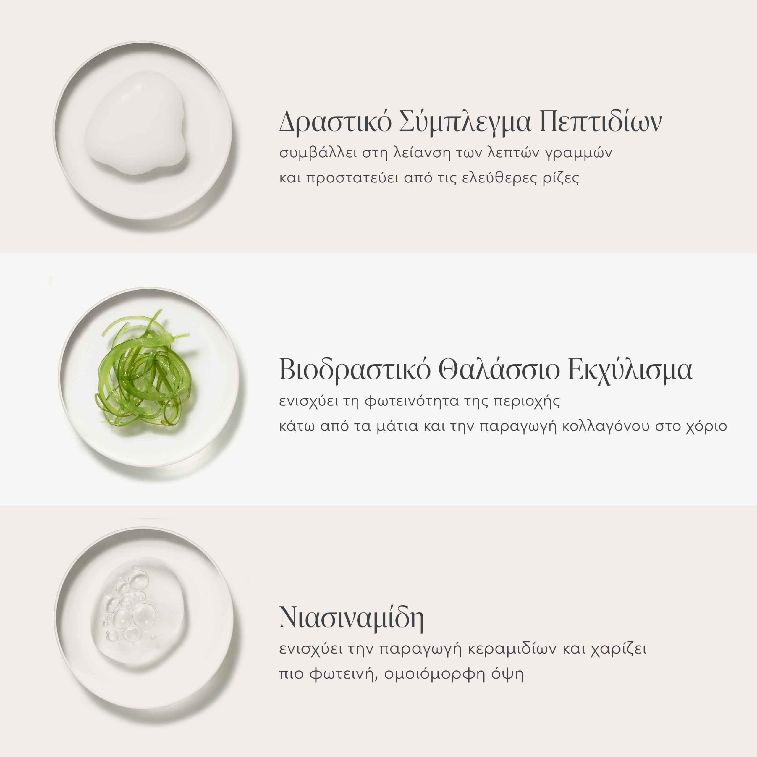 • Βιοδραστικό Θαλάσσιο Εκχύλισμα: ενισχύει τη φωτεινότητα της περιοχής κάτω από τα μάτια και την παραγωγή κολλαγόνου στο χόριο